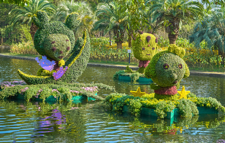 安裝在水上的卡通綠雕,卡通造型可愛,多種顏色搭配制作而成,使卡通形象更加立體化。