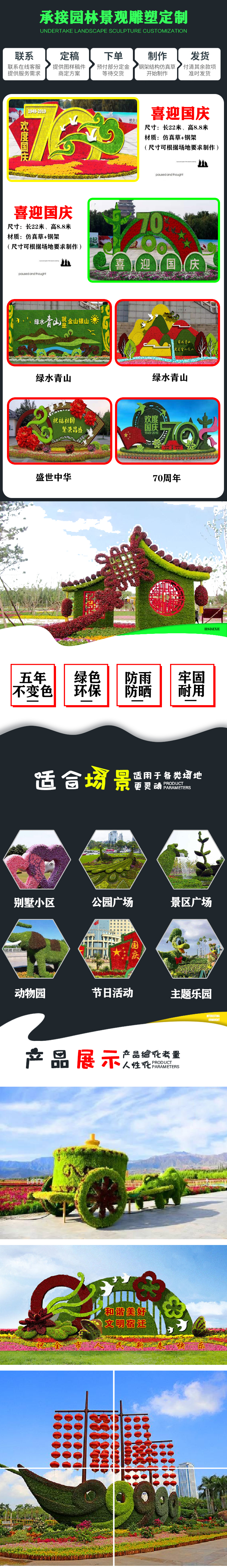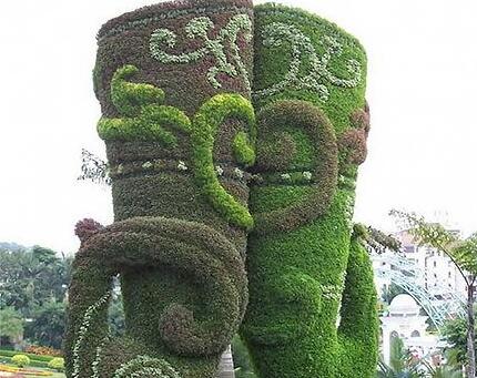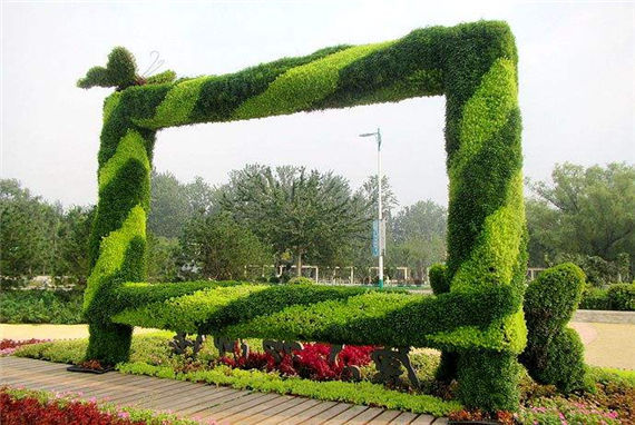在景區、主題公園和咱們的生活中,通??匆娨恍┧囆g作品,其中綠雕便是當中好看的一道風景,隨著綠雕式樣的不斷進展,技巧愈來愈準確,細節樣式紋理刻畫從而更加細致。“高顏值”不只是能夠吸引人們過來賞玩、合影留念,還能美化周圍、渲染出歡樂氣氛,提升景區、主題公園的品味及形象。綠雕又叫綠色雕塑,被稱為世界園林藝術的奇葩,是具有生命的植物雕塑,一般來說內設鋼材架構,接著在構架上填充栽培土,再于其上培育一年生及多年生小灌木及草本植物,即運用掛泥插草及卡盆工藝把不同顏色的花草覆蓋在結構技巧的表面上,很好地把雕塑技巧與花卉園藝結合在一起,鋼架表面上的植物覆蓋率起碼要得到80%。
